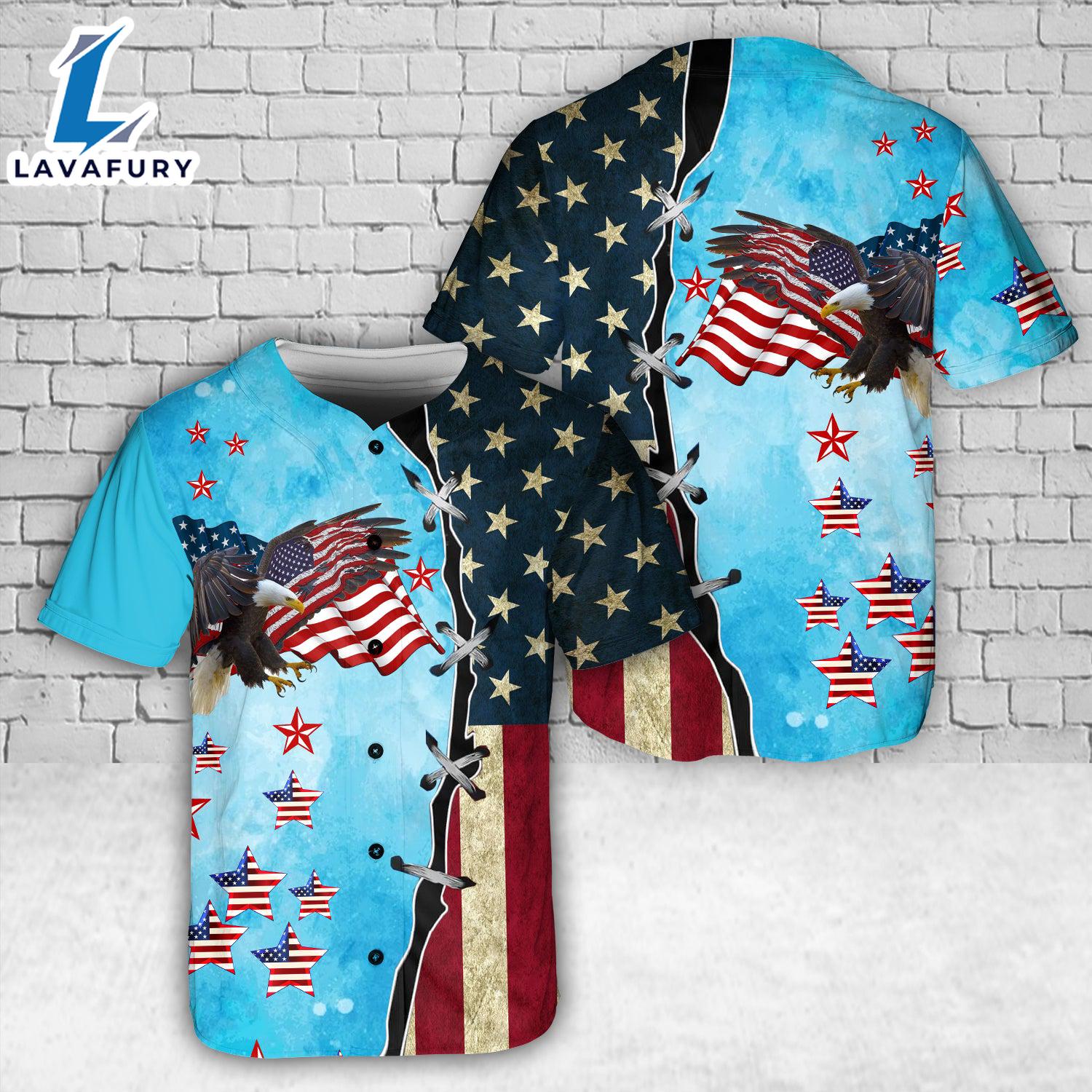 American Flag Eagle 4th Of July Baseball Jersey 4TH Of July Stay stylish on and off the field with this premium Baseball Jersey. Crafted from breathable, high-quality fabric, it offers comfort and durability for everyday wear or game day excitement. The classic button-up design and bold team logo make it a must-have for any fan. Perfect for showing off your team pride while staying cool and comfortable!