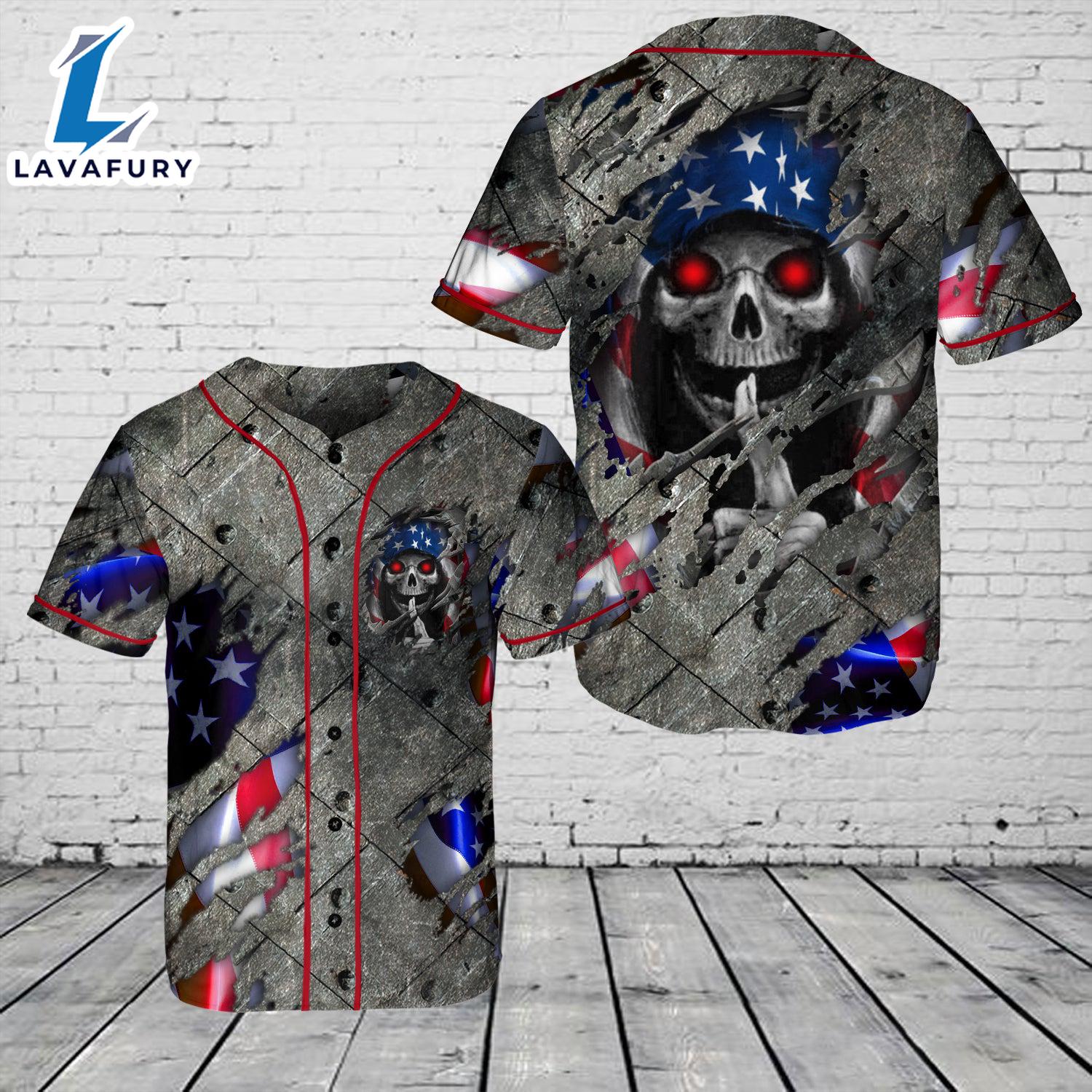 American Flag Grim Reaper Shh Red Eyes Skull Baseball Jersey 4TH Of July Stay stylish on and off the field with this premium Baseball Jersey. Crafted from breathable, high-quality fabric, it offers comfort and durability for everyday wear or game day excitement. The classic button-up design and bold team logo make it a must-have for any fan. Perfect for showing off your team pride while staying cool and comfortable!