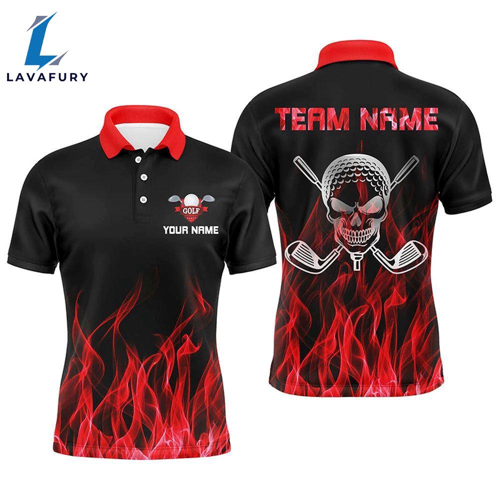 Black Mens Golf Polo Shirts Custom Red Flame Skull Golf Clubs Gift Summer