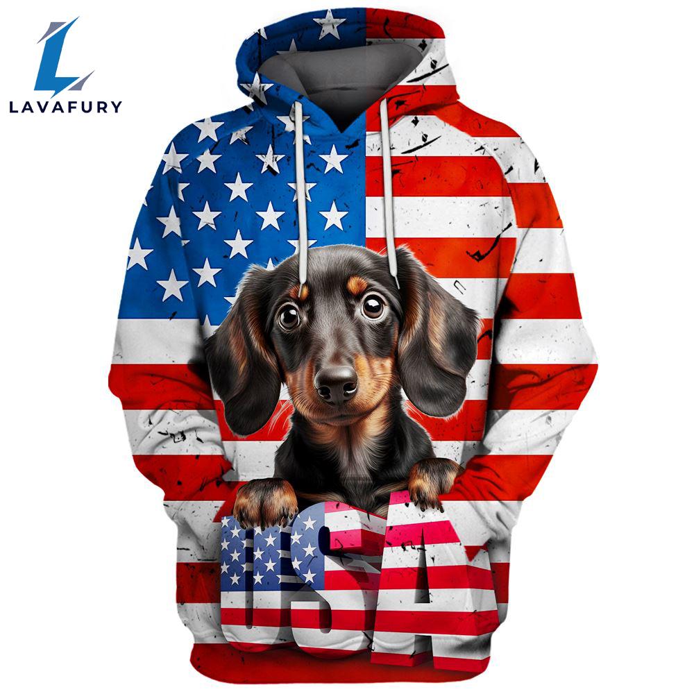 Dachshund Dog 1 3D Face Graphic Premium America Flag Hoodie For Lover Dogs The 3D shirt features an innovative design that combines cutting-edge technology with style. Its three-dimensional patterns create a dynamic and eye-catching look, making it stand out in any wardrobe. Made from high-quality, flexible fabric, this shirt ensures comfort and durability while allowing for a visually striking effect that plays with light and shadow.