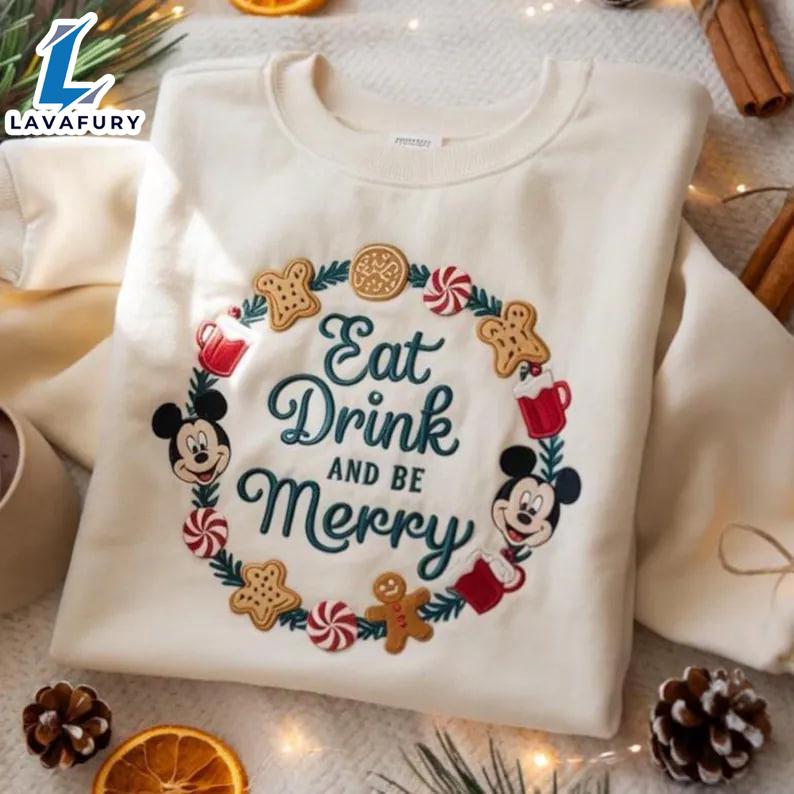 Photos Of EMBROIDERED Disney Snacks Christmas Sweatshirt, Eat Drink And Be Merry Xmas Shirt