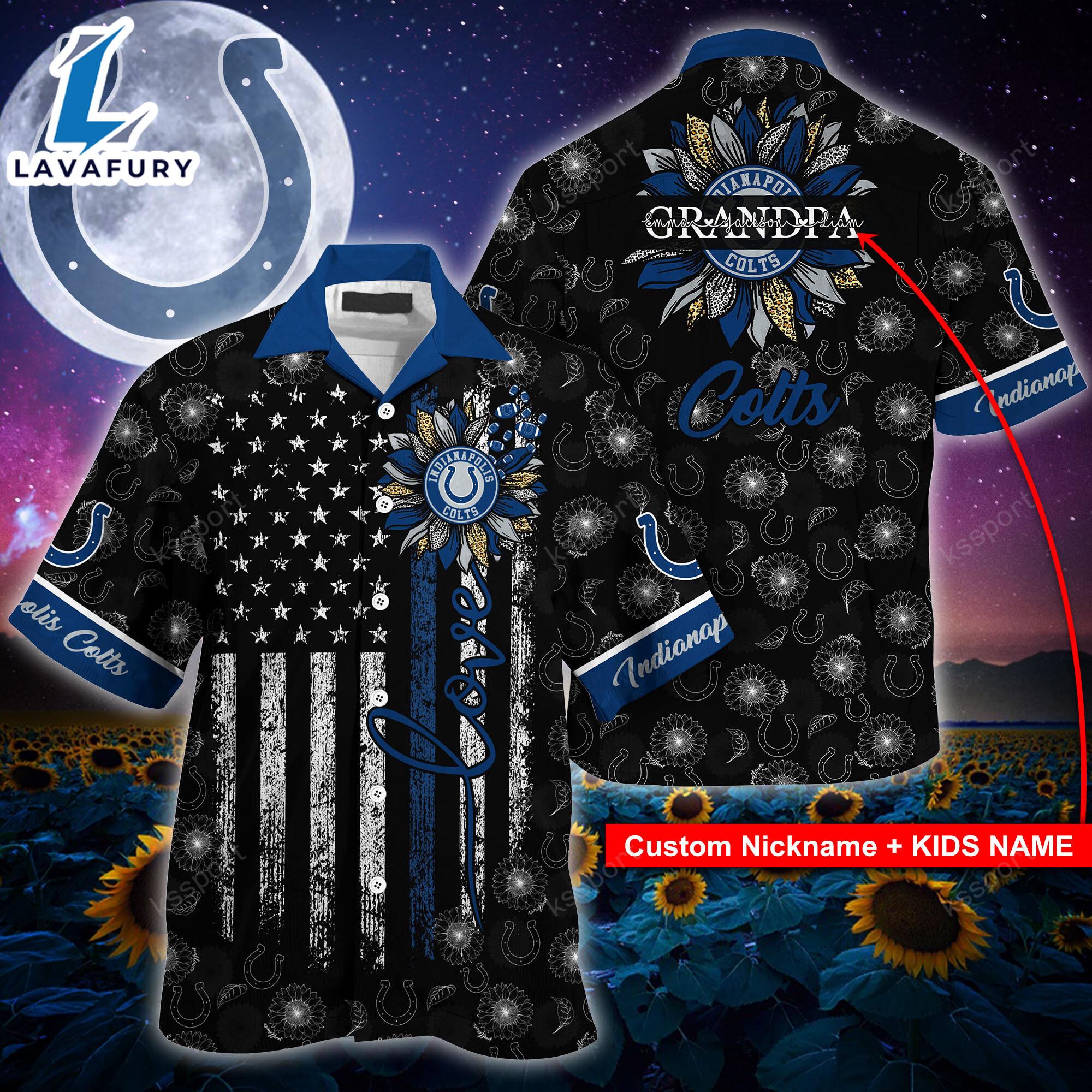 Indianapolis Colts NFL-Hawaii Shirt Sunflower Custom Your Nickname,Kids Name Best Gift For Mother Day,Father Day Very Comfortable Experience the essence of island life with the Hawaiian Shirt, a vibrant blend of style and comfort. This shirt features lively, tropical prints that evoke the carefree spirit of a beach getaway. Crafted from lightweight, breathable fabric, it offers a relaxed fit and exceptional comfort, perfect for warm weather. The classic button-down design and short sleeves provide a laid-back yet polished look, making it ideal for casual outings, beach days, or summer gatherings. Infuse your wardrobe with a touch of tropical flair and effortless charm with this essential Hawaiian Shirt.
