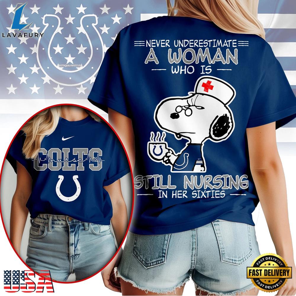 Photos Of Indianapolis Colts NFL Snoopy Never Underestimate A Nurse Women Shirt