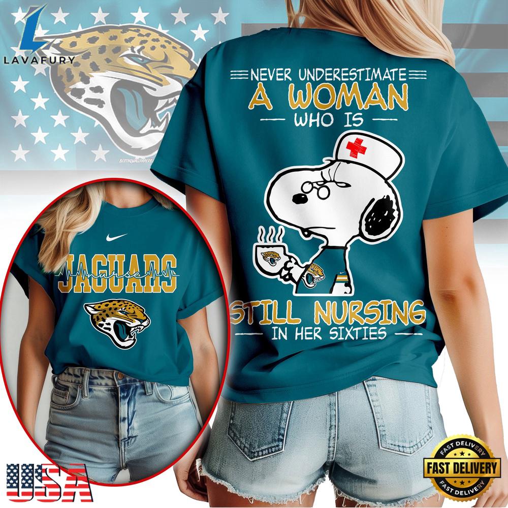 Photos Of Jacksonville Jaguars NFL Snoopy Never Underestimate A Nurse Women Shirt