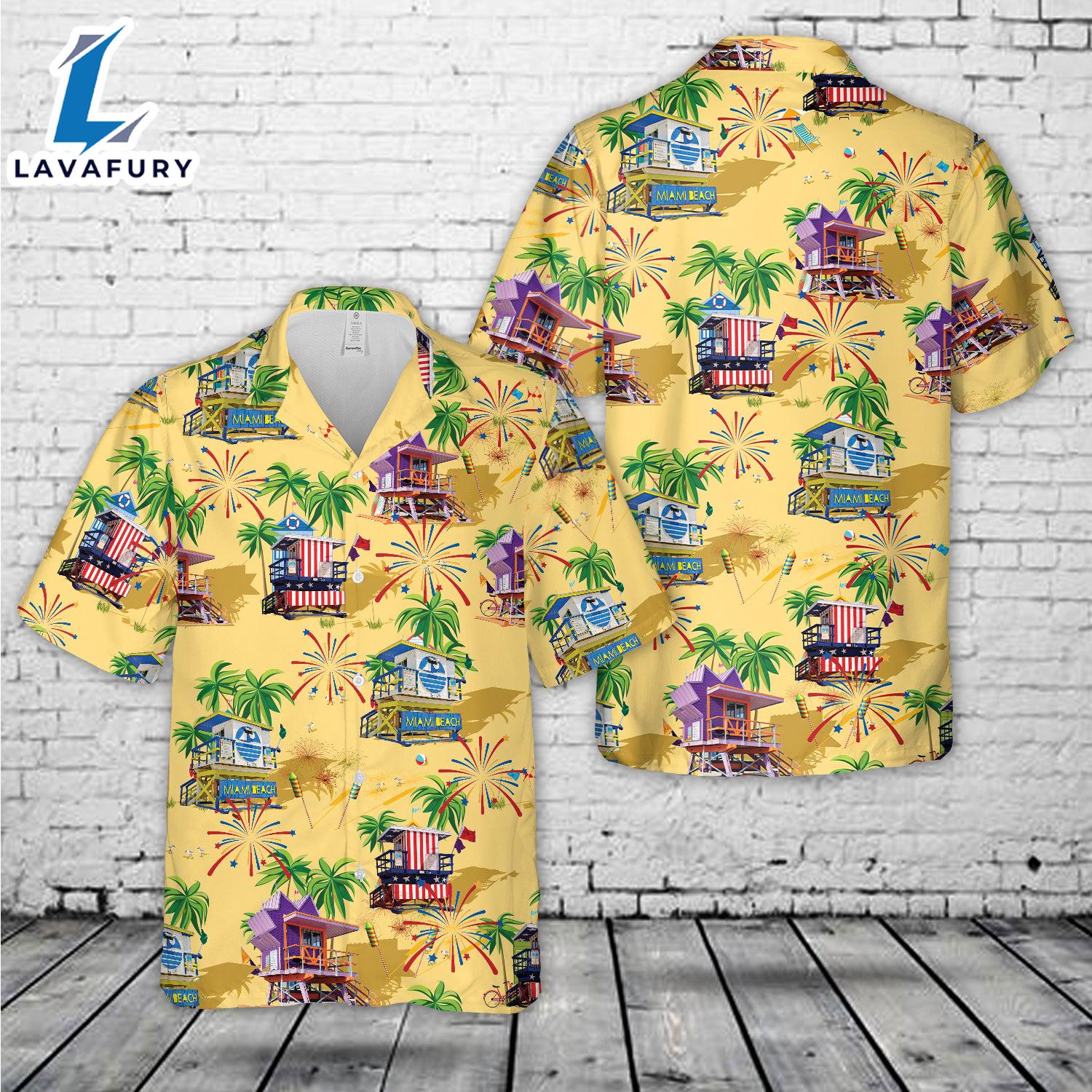 Lifeguard Hut Miami Beach, 4th Of July Hawaiian Shirt 4TH Of July Experience the essence of island life with the Hawaiian Shirt, a vibrant blend of style and comfort. This shirt features lively, tropical prints that evoke the carefree spirit of a beach getaway. Crafted from lightweight, breathable fabric, it offers a relaxed fit and exceptional comfort, perfect for warm weather. The classic button-down design and short sleeves provide a laid-back yet polished look, making it ideal for casual outings, beach days, or summer gatherings. Infuse your wardrobe with a touch of tropical flair and effortless charm with this essential Hawaiian Shirt.