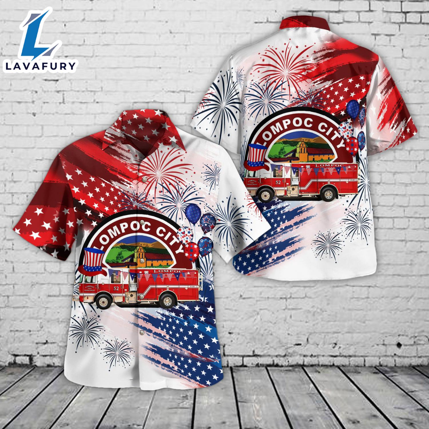 Lompoc, California, Lompoc Fire Department, 4th Of July Hawaiian Shirt 4TH Of July Experience the essence of island life with the Hawaiian Shirt, a vibrant blend of style and comfort. This shirt features lively, tropical prints that evoke the carefree spirit of a beach getaway. Crafted from lightweight, breathable fabric, it offers a relaxed fit and exceptional comfort, perfect for warm weather. The classic button-down design and short sleeves provide a laid-back yet polished look, making it ideal for casual outings, beach days, or summer gatherings. Infuse your wardrobe with a touch of tropical flair and effortless charm with this essential Hawaiian Shirt.