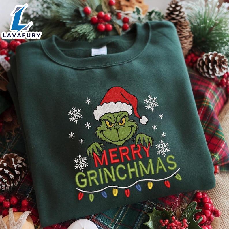 Product details: Merry Grinchmas Embroidered Sweatshirt, Funny Christmas Sweater, Grinch Embroidery Shirt