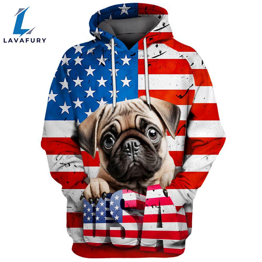 Pug Dog 2 3D Face Graphic Premium America Flag Hoodie For Lover Dogs The 3D shirt features an innovative design that combines cutting-edge technology with style. Its three-dimensional patterns create a dynamic and eye-catching look, making it stand out in any wardrobe. Made from high-quality, flexible fabric, this shirt ensures comfort and durability while allowing for a visually striking effect that plays with light and shadow.