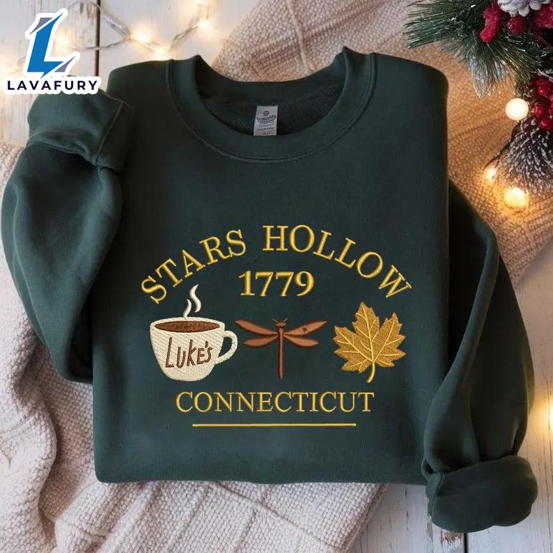 Stars Hollow Embroidered Sweatshirt, Fall Sweatshirt, Cozy Small Town Crewneck An embroidered sweatshirt is a cozy and stylish piece of clothing, typically made from soft cotton or fleece. It features intricate embroidered designs, adding a personal and artistic touch. These designs can range from simple logos or text to more detailed patterns, making each sweatshirt unique. Perfect for casual wear, embroidered sweatshirts combine comfort with a creative flair, suitable for everyday use or as a standout fashion statement.